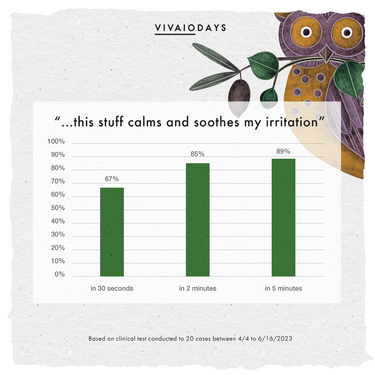 In just 30 seconds, 67% of users experienced noticeable calming of skin irritation. That number jumped to 85% in 2 minutes and reached 89% within 5 minutes—proving how quickly and effectively this formula delivers comfort when your skin needs it most.